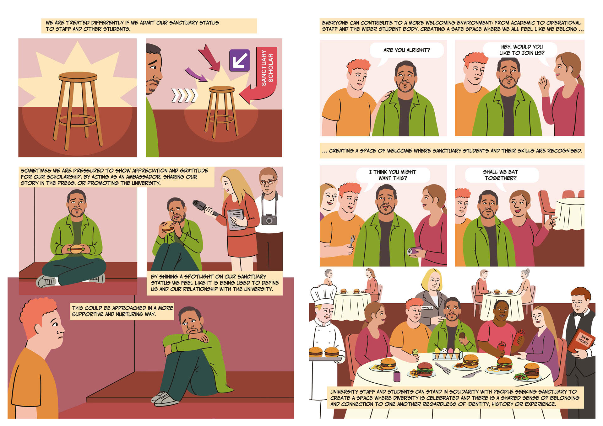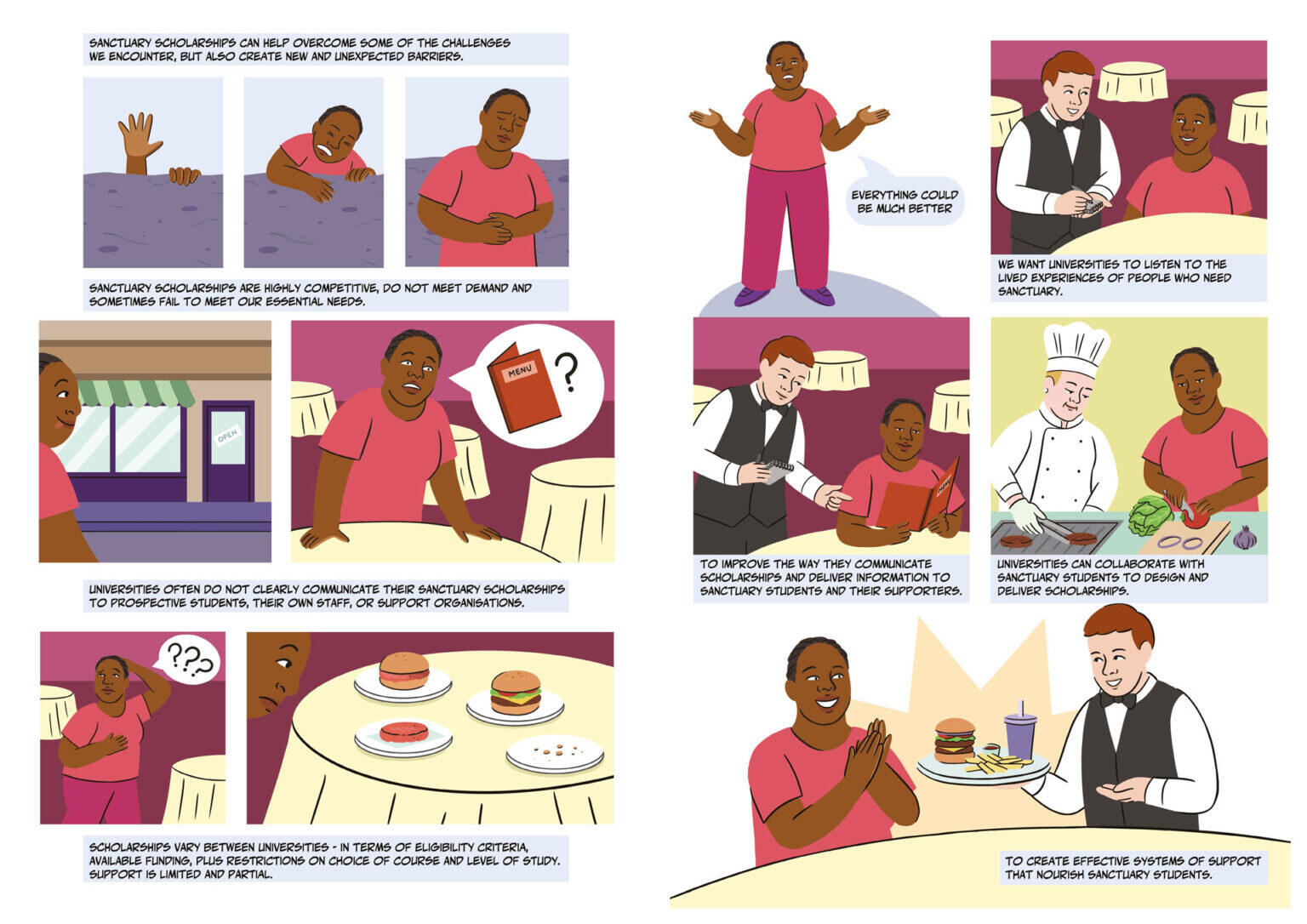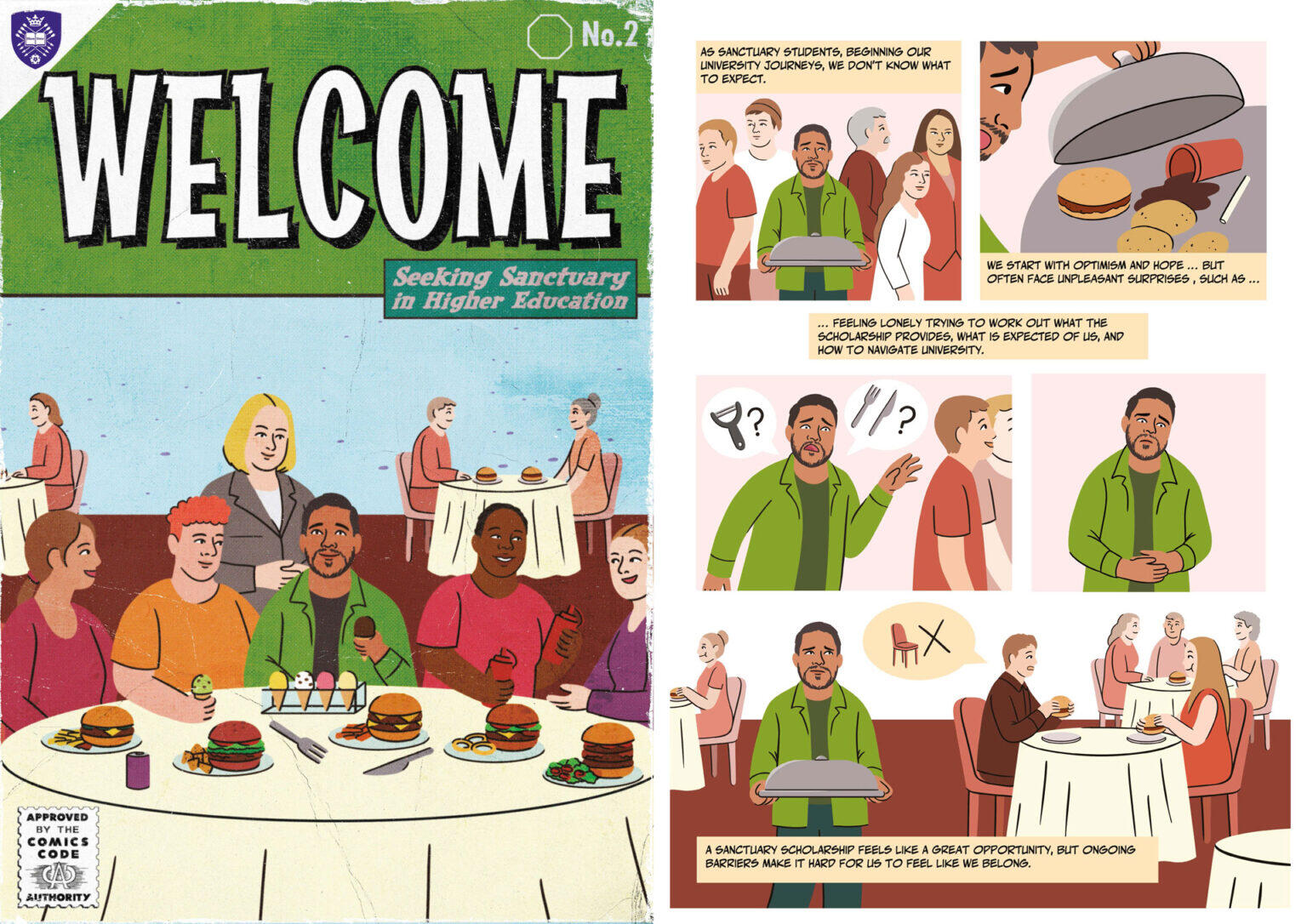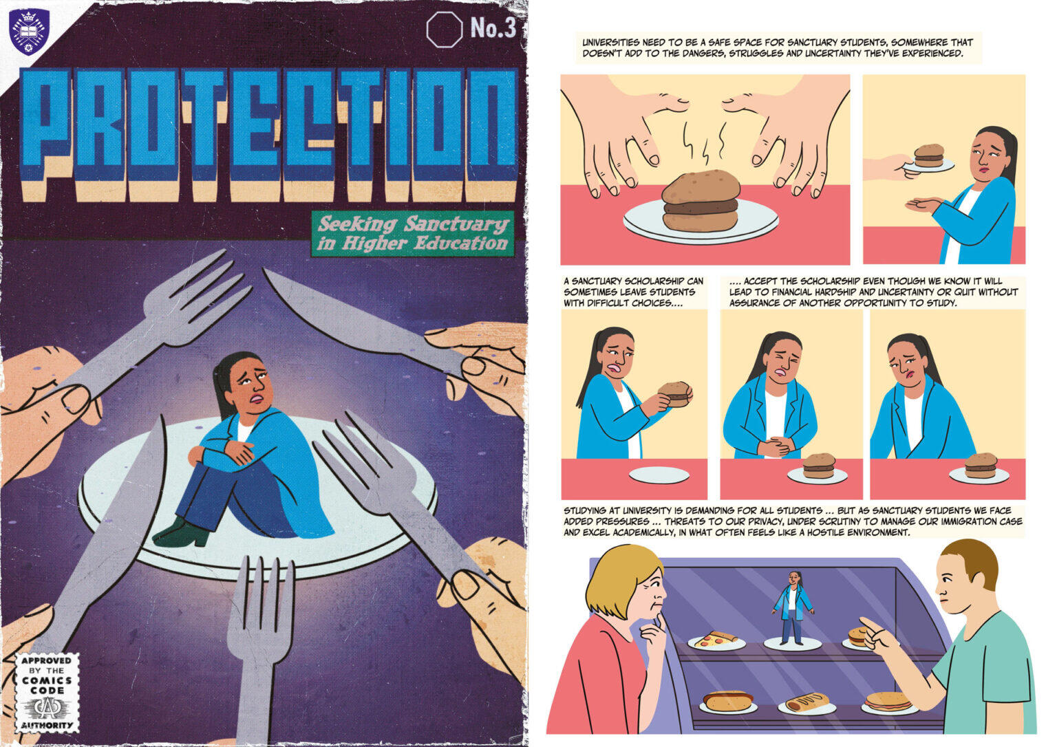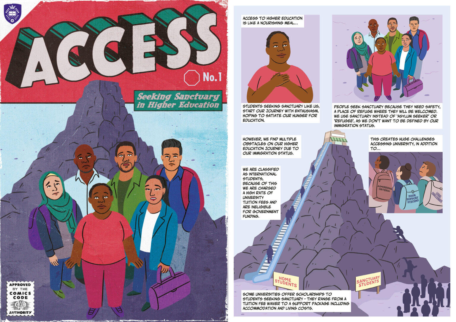 Seeking Sanctuary in Higher Education is a project funded by the University of Sheffield, and builds on insights from the (Re)imagining the Higher Education Border research project.It was made in collaboration with experts by experience in relation to displacement, studying in HE as sanctuary students and active in campaign initiatives lobbying to improve access to and opportunities within university.The project produced a series of comic strips and animations that sought to communicate: